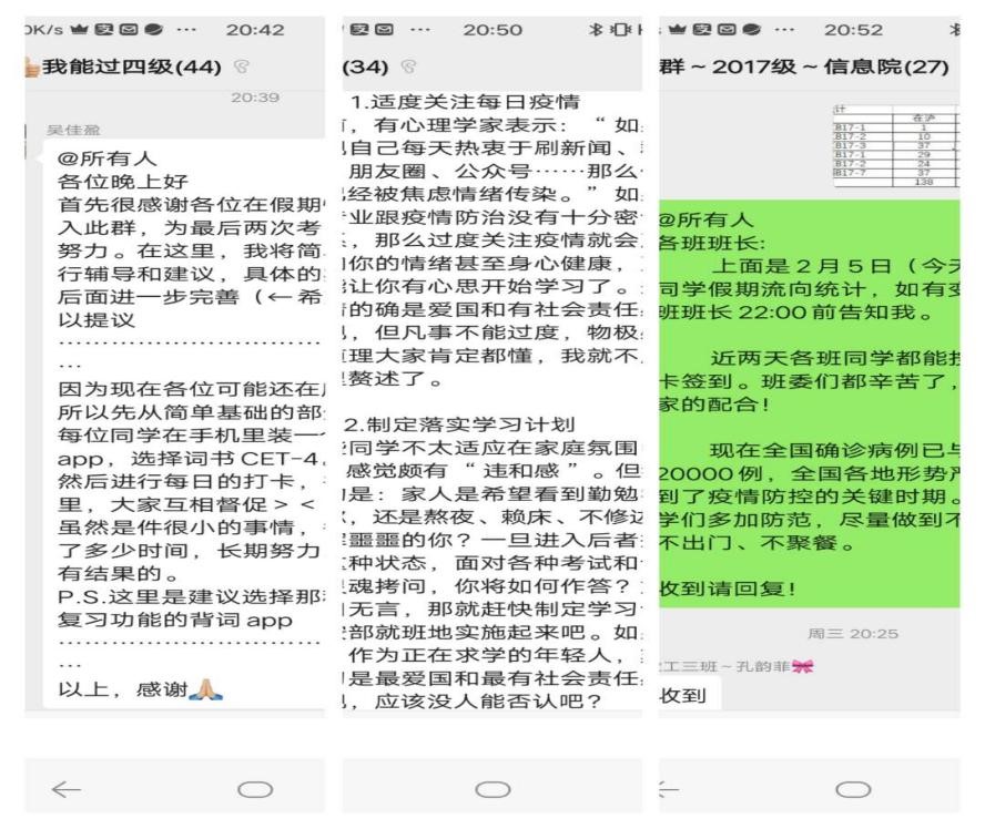 为让同学们充实地度过这个既“长”又“宅”的假期,我发动学习优秀的同学们创建学习交流群,以期待同学们学习资源共享、学习方法互鉴。到今天为止,我的班级已经建立起“我能过四级”、“计算机等级考试必过群”“高等数学补考必过群”“移动应用开发必过群”等各类学习群,各群负责人也已经开始分享学习资料,并带领大家制定学习计划。当看到同学们能够积极主动加入学习群,各群负责人克服困难,为同学们找到并分享最全最实用的学习资料时,我知道,同学们没有因为“疫情”而降低学习的热情,更没有让暂时的困难阻挡住前进的脚步。