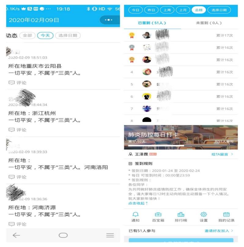 查看同学们的打卡签到记录已成为我每天打开手机的一个习惯,每天晚上,等两个孩子安静的入睡后,我还要打开电脑再核对下汇总数据是否有误。让我倍感欣慰的是,每位同学都很配合工作,各班班委也都很尽心尽责,每天提醒和督促同学们签到,发现有同学没有签到,或者签到有变化的情况,都及时反馈给我,我会及时和相关同学或者家长联系沟通,听到每个同学都安全和健康,我也安心了。