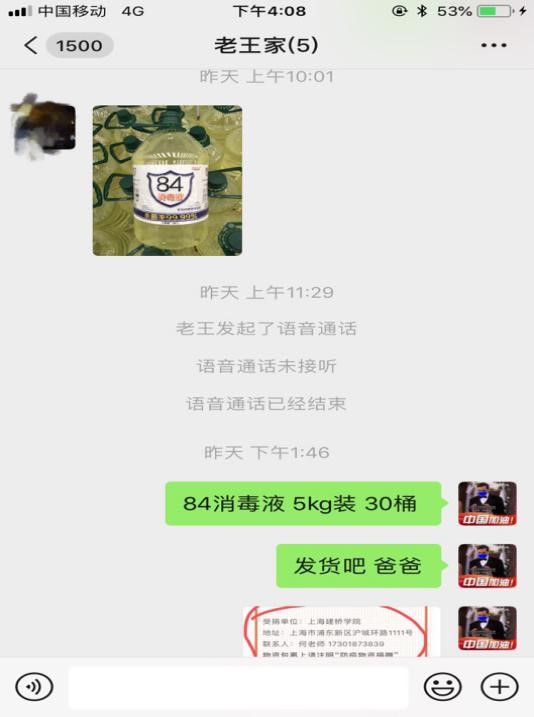 王卓表示:令他暖心的是,家人都非常支持他的想法,特别是王卓父亲,他是做交通运输工作的,一听到消息就赶忙发动朋友圈询问物资,但无奈各地资源紧缺,只能找到消毒液,他们一次购买了30桶84消毒液,委托朋友帮忙发货。希望能贡献一份力量让同学们早日安全健康地返回校园。。