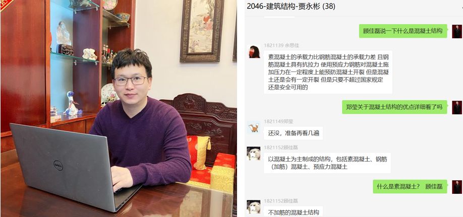 工程管理系贾永彬老师承担了《建筑结构课程》教学工作。在上课期间,学生们积极在线学习《混凝土结构基本原理》视频课程,在视频学习中讲解充分,同时在微信交流中为同学们答疑解惑,师生交流顺畅。为了让同学们有更好的上课效果,贾老师利用微信和腾讯会议平台相结的方式,进行提问和交流来验证学习效果。
