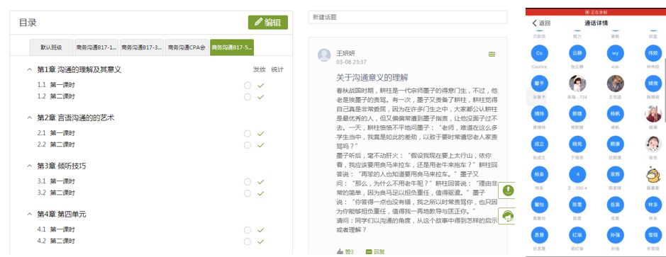 旅游管理系王妍妍老师利用网络平台构建“课前预习、课中互动、课后答疑”的全过程云中沟通模式。在前期备课阶段,不断搜集、比较并挑选出适合学生的优质线上教学资料,并上传至超星学习通的平台;在课前一周内,布置相应的课前小练习,并通过平台统计学生的在线学习时间鼓励学生高效自学;课堂上,利用钉钉会议的开麦问答模式和钉钉直播的抢答互动模式,鼓励学生积极参与到课程中来;课后利用钉钉群,就课程的相关问题进行全天候的在线答疑。全过程、全范围的师生沟通模式为保证《商务沟通》的在线教学效果提供了保障。