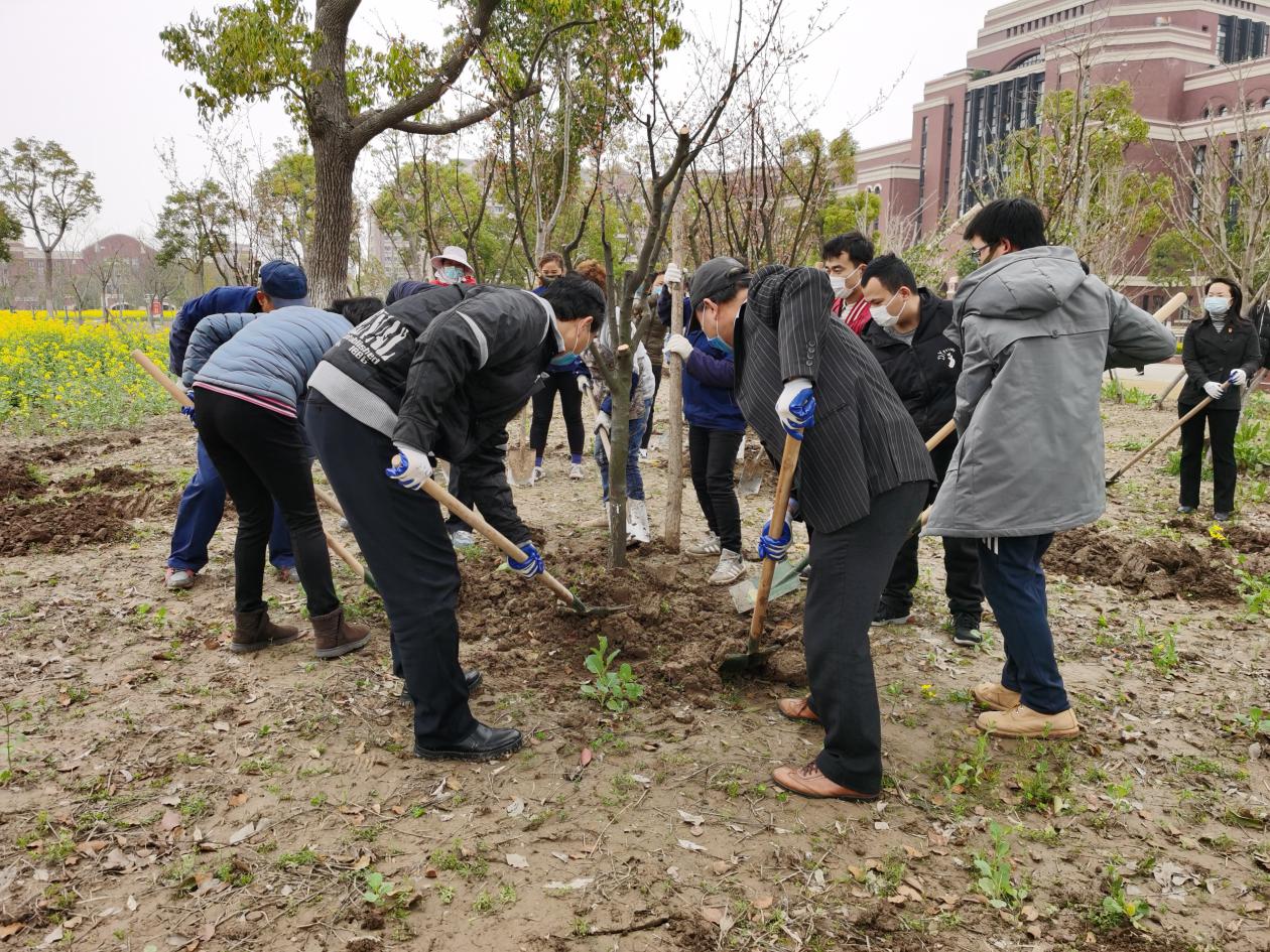 当下正处于疫情防控期间,所有人员均佩戴口罩。绿化服务中心员工向大家详细地介绍了植树的方法和技巧,并给大家做了示范:“植树讲究深挖浅种,深挖坑,然后放入些松土,再把树放在松土上,树才容易扎根”。大家自发结组,各有分工,尽管戴着口罩,但丝毫不影响“劳动”的热情,到处都是忙碌的身影,有的挖土,有的扶苗,有的填坑,植树活动如火如荼地进行着。在大家的共同努力下,近30株新栽种的树苗迎风而立,为校园增添了一道靓丽的风景线。
