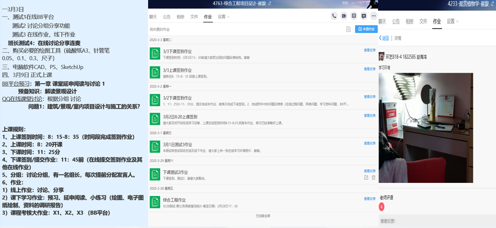 同样顾善文老师将《灯光照明设计》原本的建材市场调研均改为网络调研。积极响应学校号召,是把学生组织起来,分小组学习,发动学生自己的力量。线上教学的特点是‘划重点’‘碎片化’,应该充分利用其特点,让它成为常态化学习的一部分。