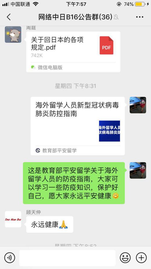 海外学子是学校最大的牵挂,中日合作项目负责人刘潇滢老师时刻与京都情报大学院大学保持沟通,向学生传达在日疫情防控指南,定期开展师生联络会,密切关注在日学子的健康和生活情况。同时,刘潇滢老师提醒同学们提高自我防护意识,主动定期地向双方学校报告健康状况以及学业情况,以便学校能够及时予以协助与支援。当前全球疫情还在蔓延,疫情防控正处在关键阶段,希望海外学子们保持理性和科学的态度,把握与配合在日本的抗疫指引与措施,保护好自己,和祖国人民一起,和日本一起,同舟共济、共克时艰。