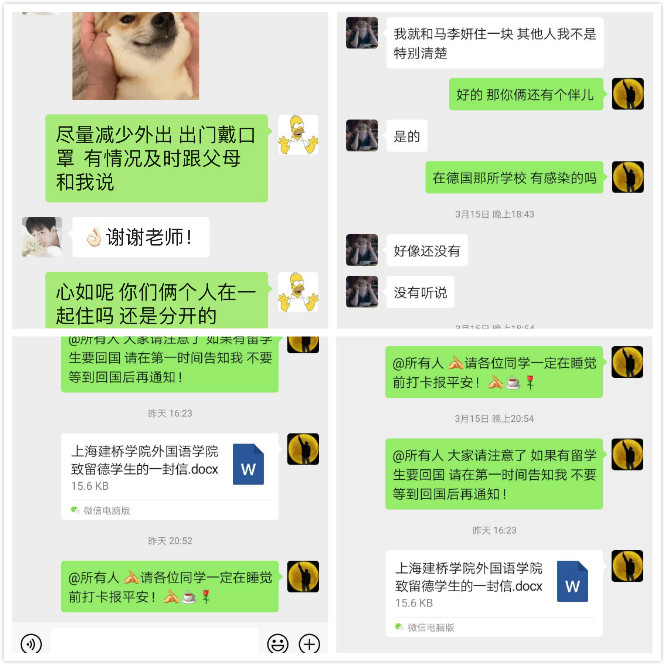 外国语学院时刻关注疫情的发展,并为在海外交流的学生写信传递祝福与关怀。学院老师向学生宣传了防控新型冠状病毒相关知识,请学生及时反馈遇到的问题和困难。3月17日,德语系与留德学子们举行了一场超远程电话会议,在电话会议中,系主任详细询问了德国特别是慕尼黑的现状,对于学生们的生活状态、防疫物资、学习情况等,均表达了关切之情,并回答了16级毕业生关于毕业等情况的各种提问。尽管目前德国防疫情势并不明朗,但是学生们纷纷表示,已经做好个人健康防护准备,并且准备好一定的生活物资来响应德国政府的防疫行动。学院负责老师特别提醒有归国计划的同学,旅程中要全程做好防护工作,配合海关和国内各级政府相关部门的工作,如实上报自己的健康状况。对于暂时留在德国生活学习的同学们,老师们再三嘱咐大家,提高安全防范意识和防疫能力,时刻关注德国和慕尼黑有关疫情的变化情况,充分做好各项防疫准备工作,认真做好个人防护工作。3月20日学院再次组织与德国学生远程连线,院领导和对外交流办公室人员参加。