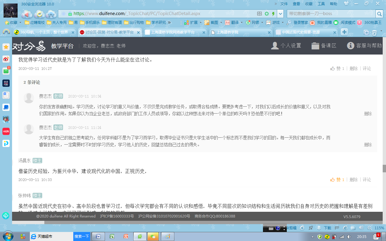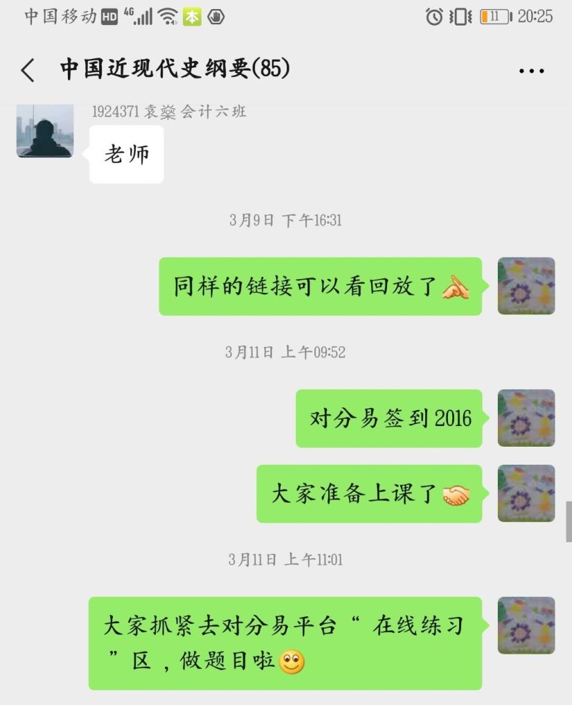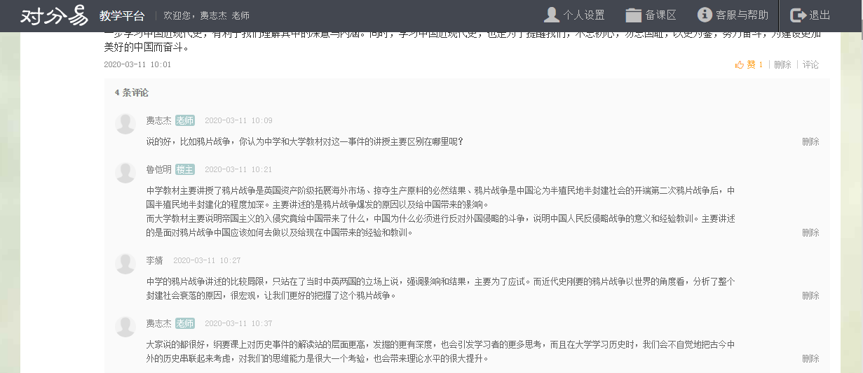 一是时间安排比较紧凑合理。为了提升课堂90分钟的互动效率,他把每一分钟都进行了合理分配,争取做到不浪费一分钟。如课前上课提示、上课考勤、在线测试、在线随堂提问、重难点讲解、集中讨论、课堂总结等多个教学环节,学生普遍感觉受益匪浅。二是内容较为丰富、形式较为灵活。从对分易签到码的发布,到缺勤学生的督促与询问;从在线测试题的开始,到测试成绩的发布;从随堂提问,到学生抢答;从不同讨论话题的选择,到学生自由设置讨论话题,让全体学生都尽情参与,最大程度上防止游离于课堂之外的现象出现。三是学生的参与度非常高。由于老师课前准备充分,绝大多数同学都参与其中,有点评也有发言,极大的提升了思政课的教学效果,激发了同学学习思政课的兴趣和热情。费老师以史论史,以史叙事,做到了从历史中解读人生,解读价值,使学生在学习历史中树立正确的价值观,真正达到思想政治教育的目的。