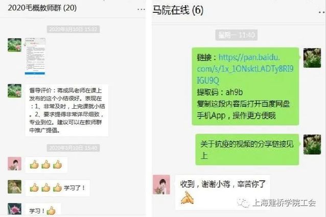蒋成凤在远程教学中的这些探索和实践,在收获学生的高度认可之外,她的“教学安排”“课堂小结”“在线练习”“课堂互动”等教学探索也受到了教学督导和同行的好评,有些还被作为优秀教学实践加以推广。较高的信息技术素养和全身心投入产生的创新实践成果,再加上在“云端思政课”方面的不懈努力和积极钻研,使得她不仅多次被学院表扬,还成为了“云端思政课”的“结对子”指导老师。
