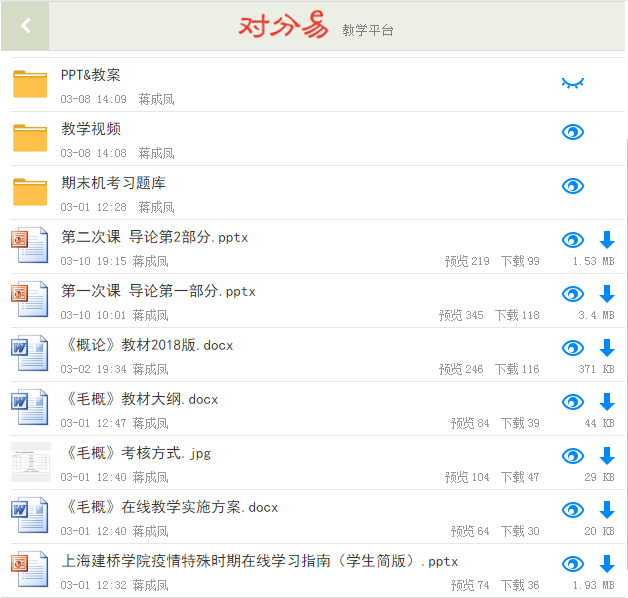 蒋成凤一方面利用自己娴熟的网络技巧建立界面亲和的“云端课程资源库”,把电子教材、考核方案、教学大纲、教学进度表、电子教案、PPT、教学视频、在线教学实施方案、课后复习题等资源共享给学生,为学生对本课程的预习、学习和复习提供最大的便利;另一方面,还利用自己对在线教学模式的前期研究积累,积极探索干货满满、教学效果良好的“云端思政课堂”。