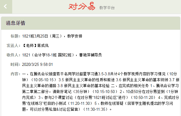 微信通知“教学安排”。她一般会在课前十分钟,以对分易消息的形式把本次课精确到每分钟的具体教学安排通知到每一位学生,使学生明确自己在90分钟的教学时间里的学习要求和任务,避免学生在在线课堂上不知所措、手忙脚乱,使得他们能在相应的时间节点完成相应的任务。