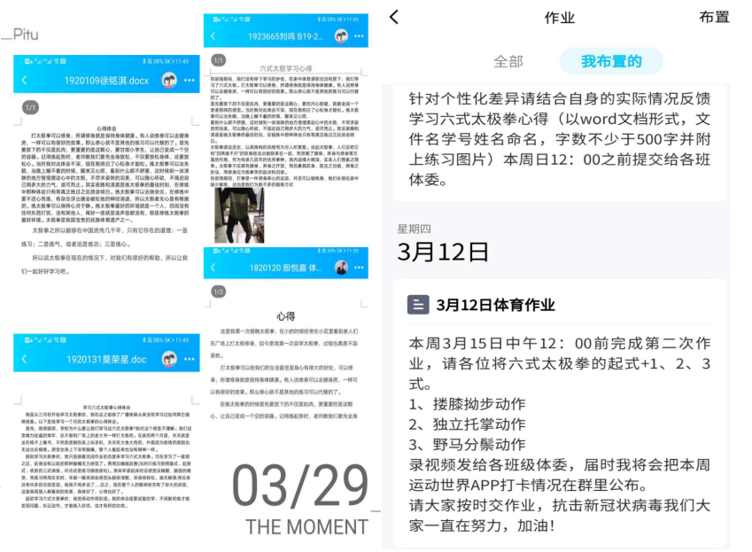 由于体育课无法亲身示范实践,为了掌握学生学习情况,提升教学质量,各位体育老师通过作业点评、学生学习感想等获得学生反馈。