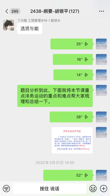 第三,在线教学采用的主要方法是:首先学生根据老师在超星平台布置的预习内容进行自学,然后老师在微信中进行语音讲解、发布PPT、图片等,最后在对分易讨论互动、在线测试等。上课一开始,先对学生预习和作业的情况进行反馈,尤其是对作业中出现错误的题目进行了纠正。接着详细讲授了本节课洋务运动的重点内容。