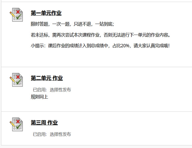 关于作业方面,针对每一章节都会有对应的题库,那么作业是从题库中自动抽调出来的,所以每个人的答卷都不尽相同,每一次的尝试,都会有新的题目出现。同时,作业的设置包含三种特性,一为“闯关式”:只有每一单元作业达到合格成绩后,才能开启第二单元的作业答题,这种方式可以督促学生对本章节的学习精益求精,不少学生会不断挑战,不断刷分,并且发微信请老师为他设置更多次的尝试机会;二是“一站到底式”,通过设置一次一题、只进不退的形式,那么每一项的答案都需要通过深思熟虑才能作答,可以有效增强学生独立思考问题的能力;三是“成就奖励式”,作业成绩提交后,根据不同的分值设置了不同的“成就”类型,对高分段的同学会发放系统奖励的徽章,低分段的同学也有相对应的警告,以此来增加学习的乐趣性。