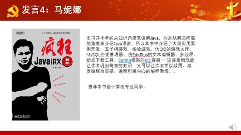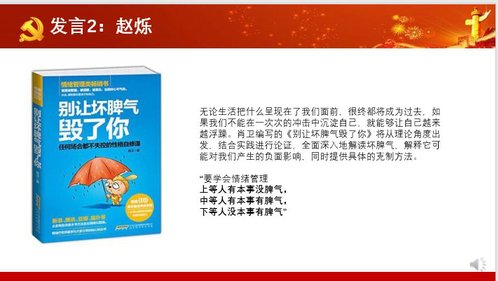 党支部全体成员还分享了自己的读书心得。臧玉洁书记向支部党员推荐了杨绛先生的散文《我们仨》,这本家庭生活回忆录,语言简洁优美,回忆了一家三口那些快乐而艰难的日子,书中对待生死的达观态度希望给与面临困境的人们以力量。赵烁老师推荐了情绪管理书籍《别让坏脾气毁了你》,在疫情隔离期间,很多时候人们难以克制自己的坏情绪,这本书从理论角度出发,结合实践进行论证,全面深入地解读坏脾气,解释它可能对我们产生的负面影响,同时提供具体的克制方法。季萍老师推荐了作家麦家的长篇小说《人生海海》,主人公的离奇故事,让人感叹人生百味。马妮娜老师向喜欢计算机编程的同学和老师推荐了一本专业书《疯狂的Java讲义》该书介绍了大量实用案例开发——五子棋游戏、梭哈游戏、仿QQ的游戏大厅等,这些案例既能让读者巩固每章的知识,又可以让读者学以致用、激发编程自豪感。胡素平老师推荐了路遥的《平凡的世界》,该书揭示了普通人在大时代历史进程中所走过的艰难道路。此外,胡老师还向英文专业的同学推荐了查尔斯兰姆的美文《Dream-children:A reverie》。