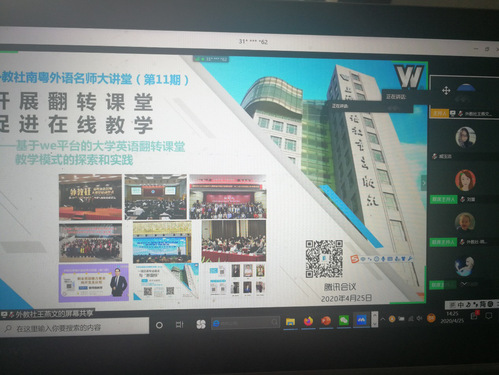 本次研修课程讨论主题为“开展翻转课堂,促进在线教学”。主讲教师针对疫情期间外语教学模式和形式的转变,展开了一系列有关如何切实提高教学效果的教学经验分享。研修课程中,广东工业大学英语教学团队骨干教师刘景老师作题为“基于WE平台的大学生英语线上教学分享”的讲座报告,具体分享了课程简介、课堂教学和课程总结思考三个方面的内容。刘老师主要通过形象生动的讲解,向大家展示了如何利用配套数字资源,推进教学任务,从而实现较为有效的师生互动,提升教学效果。主讲专家邓超群老师则以《全新版大学进阶英语视听说教程》为例,详细展示了线上平台支持下英语教学的线上翻转课堂教学模式。除此之外,主讲专家陈孝宗老师谈及了以WE Learn任务驱动来实现在线翻转课堂的教学经验,总结为“建、学、教、平”四个教学过程。