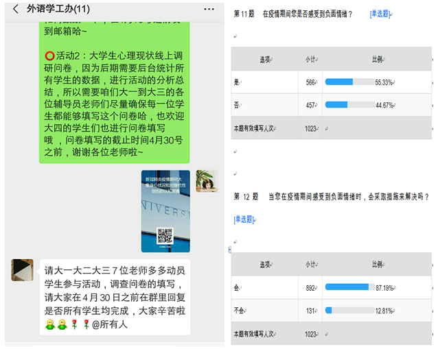 大一在2位辅导员的带领下,以班级为单位开展了“疫情无情人有情,小小举动暖人心”“‘厨神’来袭,此‘疫’必胜”等14个主题心理活动,内容包括以各种表达性载体呈现学生心理活动和积极健康风貌、宣传普及心理抗疫知识,如讲述自己的抗“疫”故事、创作各类心理健康教育的宣传作品、心理小调研等,充分开发利用学生喜爱的网络平台,激发学生的兴趣,增强在学生中的影响力,帮助大家在疫情时期缓解压力,促进学生身心健康。