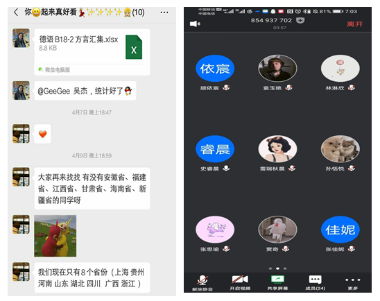 大二年级在2位辅导员的指导下,18级英语4,5,6,7商务班和德语1,2班一起举办了以“战‘疫’云相伴,方言云加油”为主题的制作微视频活动。同学们汇总各个班级同学们所在不同区域的云上方言加油视频,并分享给大家。同时18级英语2班在辅导员的带领下举办以“‘疫’境中的生命成长——我的云端心情故事和网上学习心得”为主题的班会。在繁忙的学习特殊时期,开展朋辈互助,学习自我心理调适和朋辈互助技巧,促进心理健康发展。