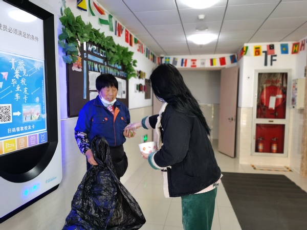 随后,留校学生们将亲手做好的青团一一打包,送到了校园一线的安保叔叔、宿管以及保洁阿姨们的手里。收到来自同学们的温暖,惊喜之余,每个人的脸上都洋溢着幸福的笑容。