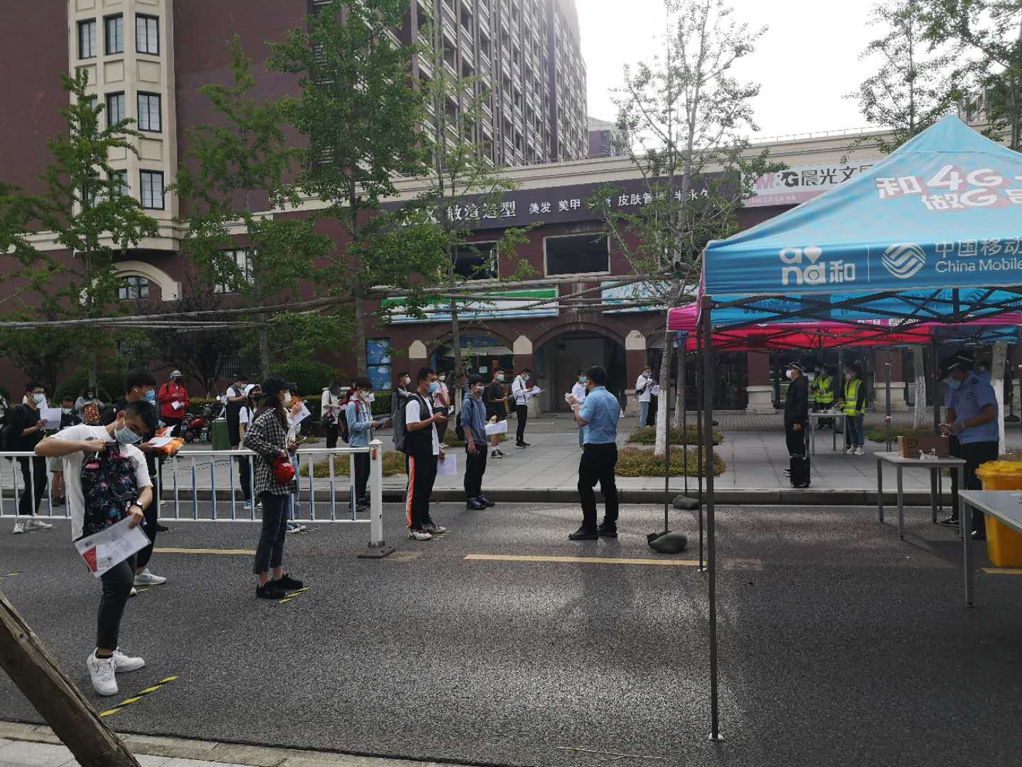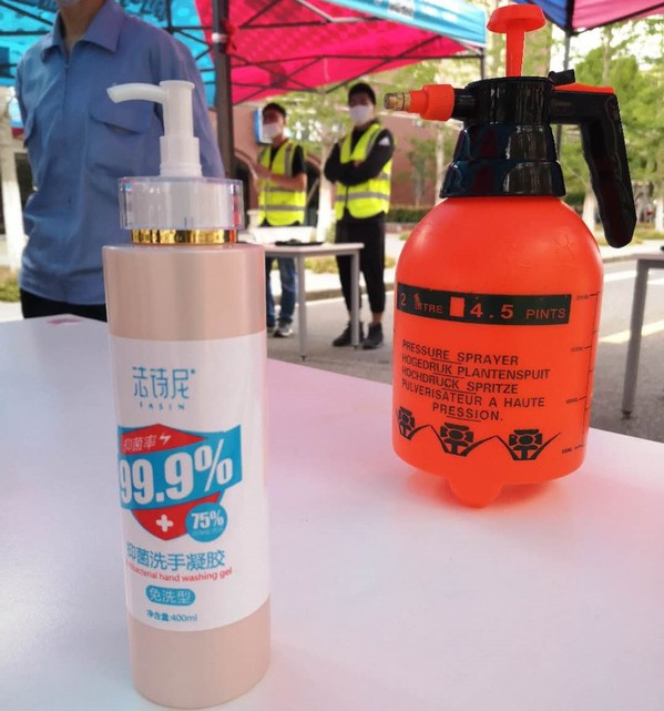 考试前一天,安保服务中心在校北门口提前布置入校区域。设置了排队等候区、测温区、消毒区以及身份核验区。物业服务中心保洁员共完成了80间考场及考生休息室的座位排布和清洁消毒杀菌工作。