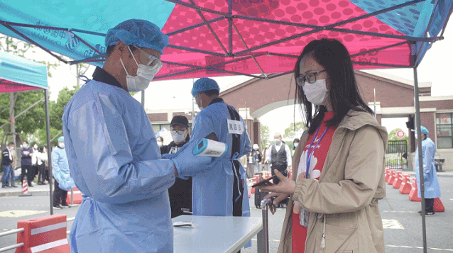 上午9点30分,疫情应急演练正式开始。在学生返校流程演练场景中,学生保持间隔距离1.5米有序排队,依次通过测温区、身份核验区以消毒区。工作人员逐一检测学生体温,发现有学生体温异常时,工作人员立即引导其前往临时医学观察点等候复测,确认体温异常时,启动应急处置。