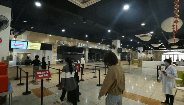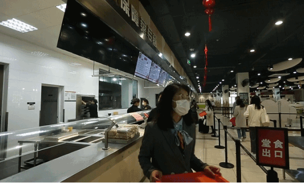 在饭堂就餐演练场景中,食堂门口设置堂食及打包排队通道,体温检测合格人员有序排队进入饭堂,就餐师生间隔1.5米的距离排队,并实行一人一桌的就餐原则,若是堂食人员接近餐厅最大限度时,工作人员做好限流排队等候指引,现场秩序人员及时通知可放行堂食及打包人数,实时管控食堂就餐情况。