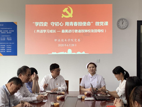 6月28日下午,最美“逆行者”、上海首批援鄂医疗支援队成员、职业技术学院护理专业2015届优秀校友诸玫琳应邀回校,与学院师生齐聚一堂,共话学习成长,开展“学四史 守初心 用青春担使命”微党课活动。学院党委书记王加宁,院长谷伟,副院长汤以范,党委副书记潘明芸,原院长、现健康管理学院院长焦庆堂等出席。诸玫琳入党介绍人程晨、带教老师郑恩玲及学院党委委员、各党支部书记、相关辅导员,及毕业生党员代表参加活动。活动由潘明芸副书记主持。