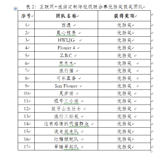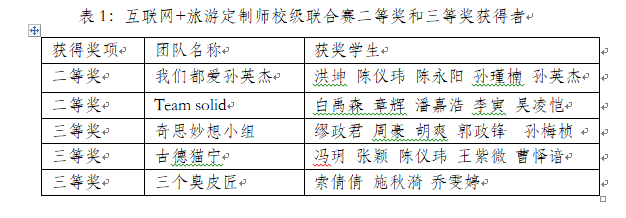 大赛分为初赛和决赛两部分。决赛于6月24日和6月27日以线上视频会议的方式举行,由大众投票和专业评委评分决出胜负。来自上海、安徽、广东等地各大高校的125名复赛选手参加了此次比赛。经大赛组委会严格考核选拔,商学院2017级旅游管理专业学生组成的22个团队入围决赛,其中5个团队分获二等奖和三等奖(表1),17个团队获得优胜奖(表2)。