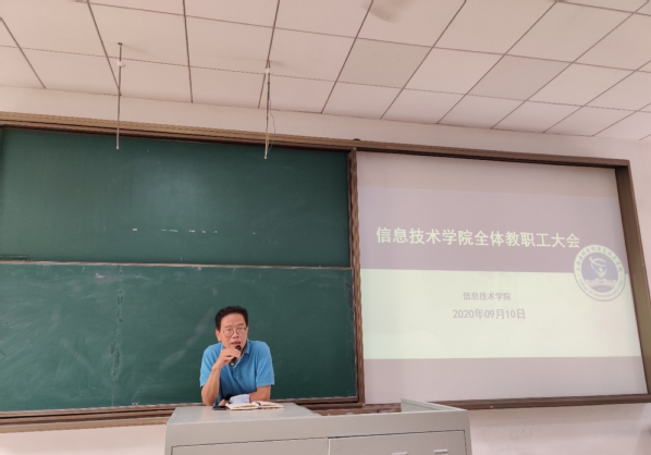 9月10日下午,信息技术学院在三教120召开2020-2021学年第一学期全体专兼职教职工大会。学院党政领导班子及全体专兼职教师出席参加会议,会议由学院党委书记张巍主持。