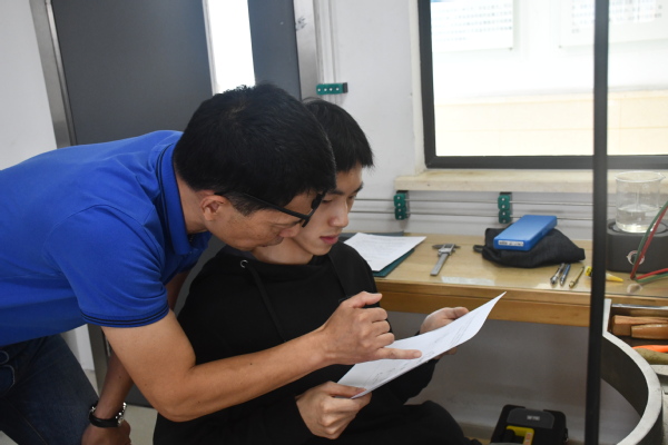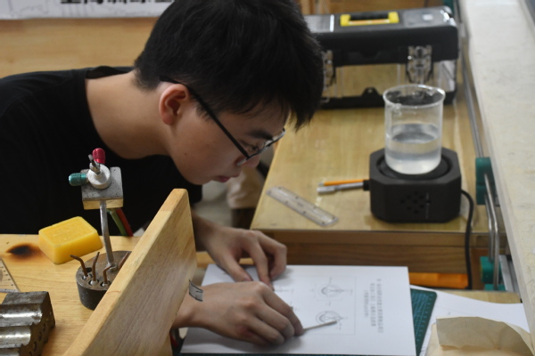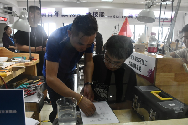 在当天考核模块《平安相随》吊坠制作过程中,我校杨逸飞、谢建维同学通过解读图稿,完成锯切、锉削、钻孔、塑(拗)形、焊接、打磨等制作工艺,配合水滴形镶口、圆形镶口、如意花纹、扇形书页等部件组合焊接成完整作品,得到技术专家与评委的认可,并最终获得第一、四名的佳绩。
