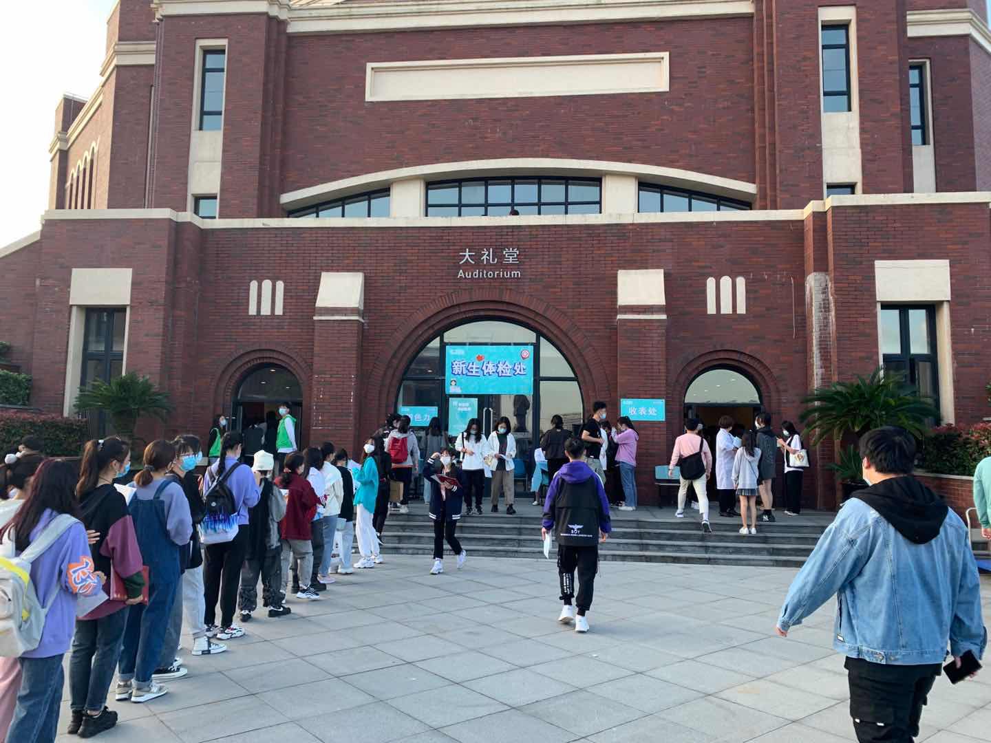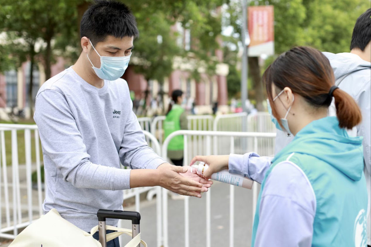 迎新期间,学校开放西门作为新生报到专用通道。在校门口,安保及志愿者早晨七点钟已全面准备就绪等待新生的到来。新生及家长有序排队,依次进行监测体温、核验健康码,并在进入校园通道前,将行李及所带物品消毒后方可进入。消毒过程认真、仔细、不留死角,严格为师生做好防疫的“第一道防线”。