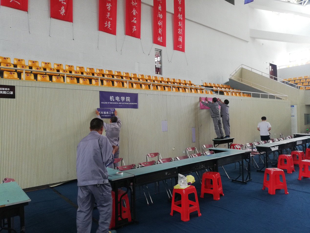 同时,维修保障中心提前做好校园基础设施的修缮和设备的维护,包括各宿舍区域、教学楼层水电额检修和排查。为了做好迎新工作的现场保障,维修人员配合做好体育馆现场悬挂张贴等布置等工作。迎新期间,维修保障中心在各学生园区设置报修点,安排工作人员全天值班,第一时间处理新生报修问题,积极助力迎新工作。