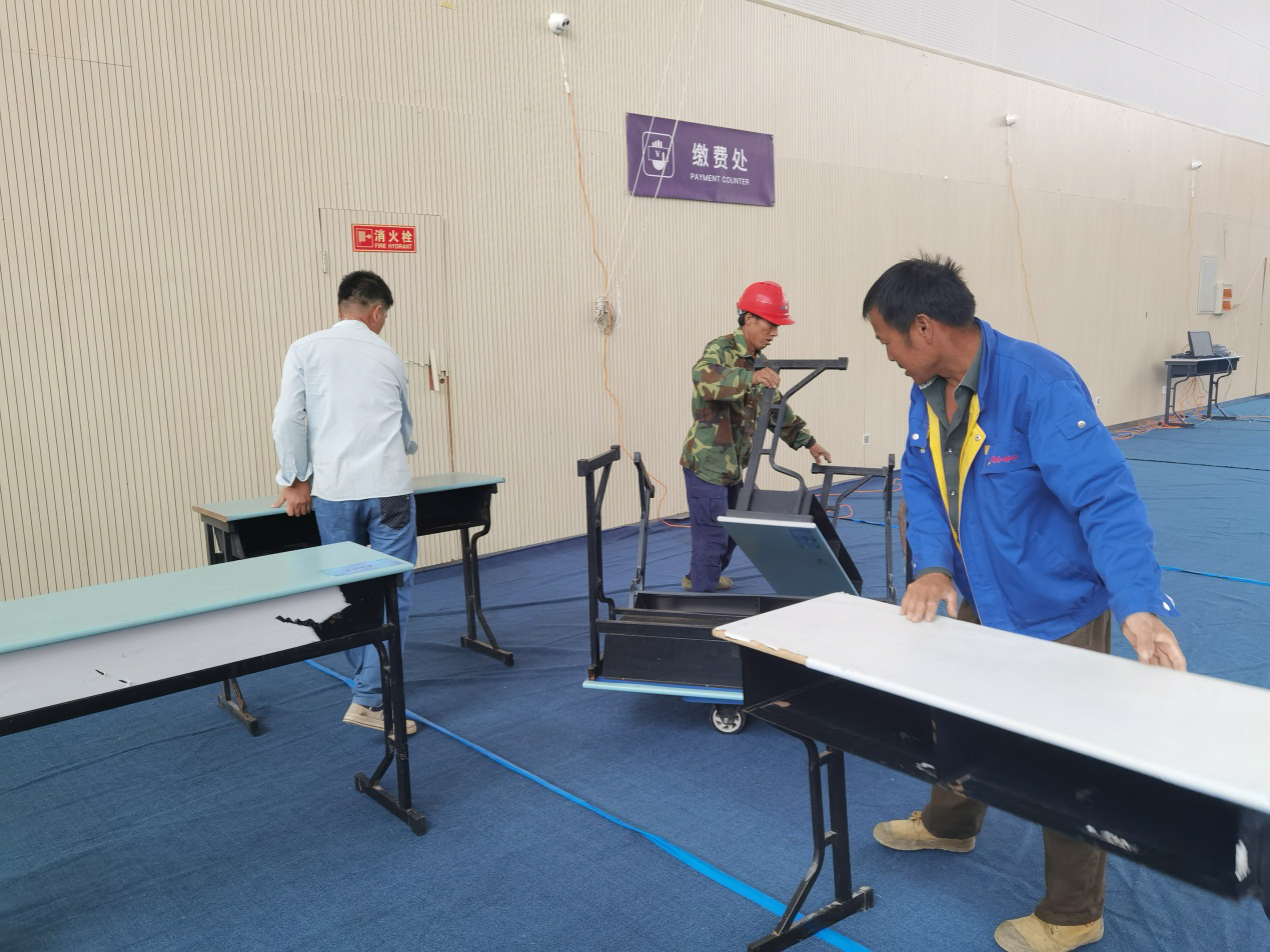 教学保障部为布置体育馆新生报到现场提前铺设地毯,搬运摆放桌子170张,椅子380个,为报到现场及志愿者服务点搬运瓶装水共460箱。