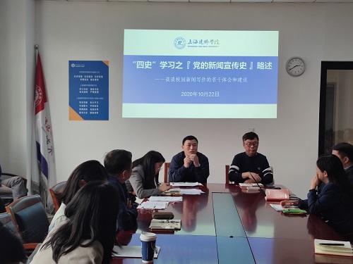 学院党委委员、学院办公室主任陈少东讲述“四史”学习之党的新闻宣传史略述,陈主任通过带领全体老师粗略回顾党的建立以来不同时期新闻宣传发展史,大体掌握和了解了党的新闻宣传主张、新闻宣传策略。同时,结合实际案例,分析和分享新闻写作体会,通过案例分析的形式,提出了校园新闻写作的方法和建议。