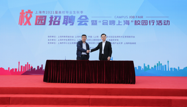 本次招聘会上,上海市学生事务中心与临港新区管理委员会签订了上海自由贸易试验区临港新片区高校毕业生育才选才合作备忘录,双方搭建起一个完善和高效的就业信息平台,从而实现大学生“低成本”就业与用人单位“高效率”选人的双赢目标。