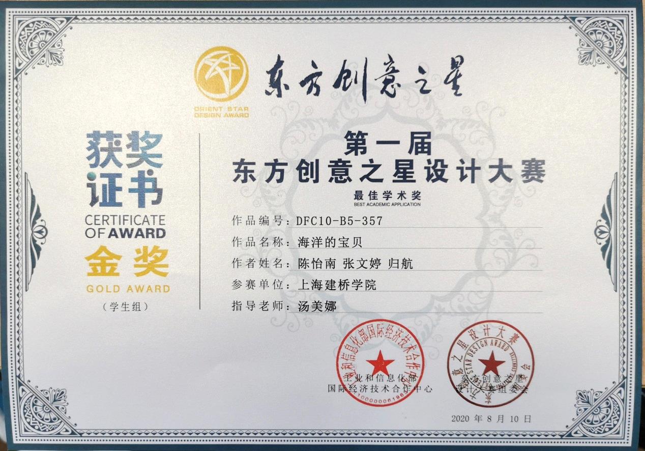 东方创意之星设计大赛特设学生组、专业组两个种类,使学生与产业一线设计师和知名大师的作品同台亮相交辉相映,为不同的参赛者创造难得的艺术价值。在本次设计大赛美术类作品中,参展作品设计门类众多,包括:服装设计、VI形象、环境艺术、产品设计、数字媒体、影视艺术、非遗主题、企业命题等,我校共参与4个门类,其中艺术设计学院的《海洋的宝贝》获得金奖,指导教师汤美娜获得优秀指导教师奖,学校获得优秀组织单位奖的殊荣。