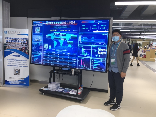 11月5日-10日,第三届中国国际进口博览会在上海举办,我校校企合作单位上海跨境公共服务有限公司与上海跨境电子商务行业协会携手搭建的跨境进口电商联盟展区亮相进博会。我校教师张江、学生兰沐筱作为工作组成员参与相关工作,向参展观众介绍上海口岸跨境电商情况,通过对跨境进口电商联盟交易数据可视化大屏的讲解,向观众介绍上海口岸的跨境电商业务的总体规模、消费者画像、消费市场情报等实时信息。