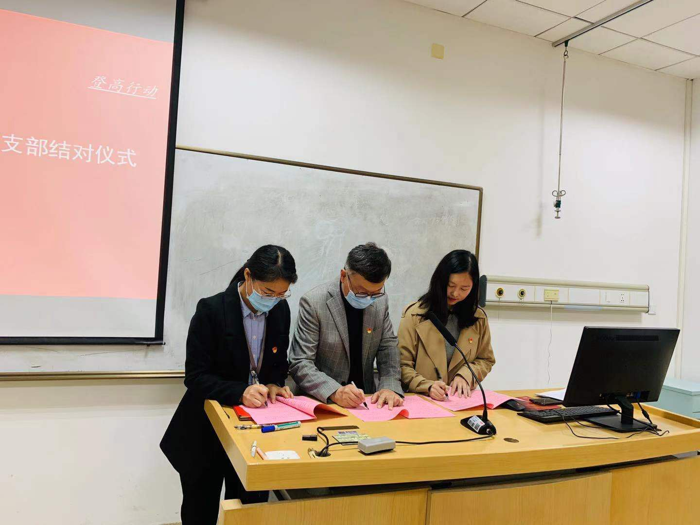 主题党日活动上,综合教师党支部和外语学生党支部签署《教师党支部与学生党支部结对共建协议书》,与会师生认真阅读相关实施方案和协议内容后,职业技术学院党委书记王加宁、综合教师党支部书记臧玉洁和外语学生党支部潘明芸正式签署了协议书。臧玉洁书记指出,本次共建以结对共建活动为载体,探索师生党支部之间优势互补、资源共享、共同发展的党建新思路,按照“以共建促党建,以共建促了解,以共建促合作,以共建促发展”的原则,坚持教师服务学生、以学生为中心的宗旨,充分发挥基层党支部的战斗堡垒作用。