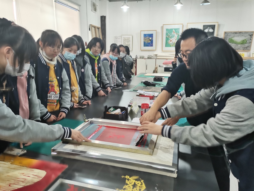 总支书记周智明在展览馆与同学们亲切会面交流,对同学们今后的学习、生活给予了建议,他鼓励同学们坚定理想信念,树立远大理想,勇担时代责任,学好专业知识,在国家进步和发展的过程中做一名推动者和奉献者,充分展现新时代青年的风采。随后,同学们来到版画工作室,徐巍副教授为同学们展示了丝网版画的制作,同学们饶有兴趣地实操体验,感受版画艺术的魅力。中午同学们享用了建桥的美食,沐浴了校园的阳光。