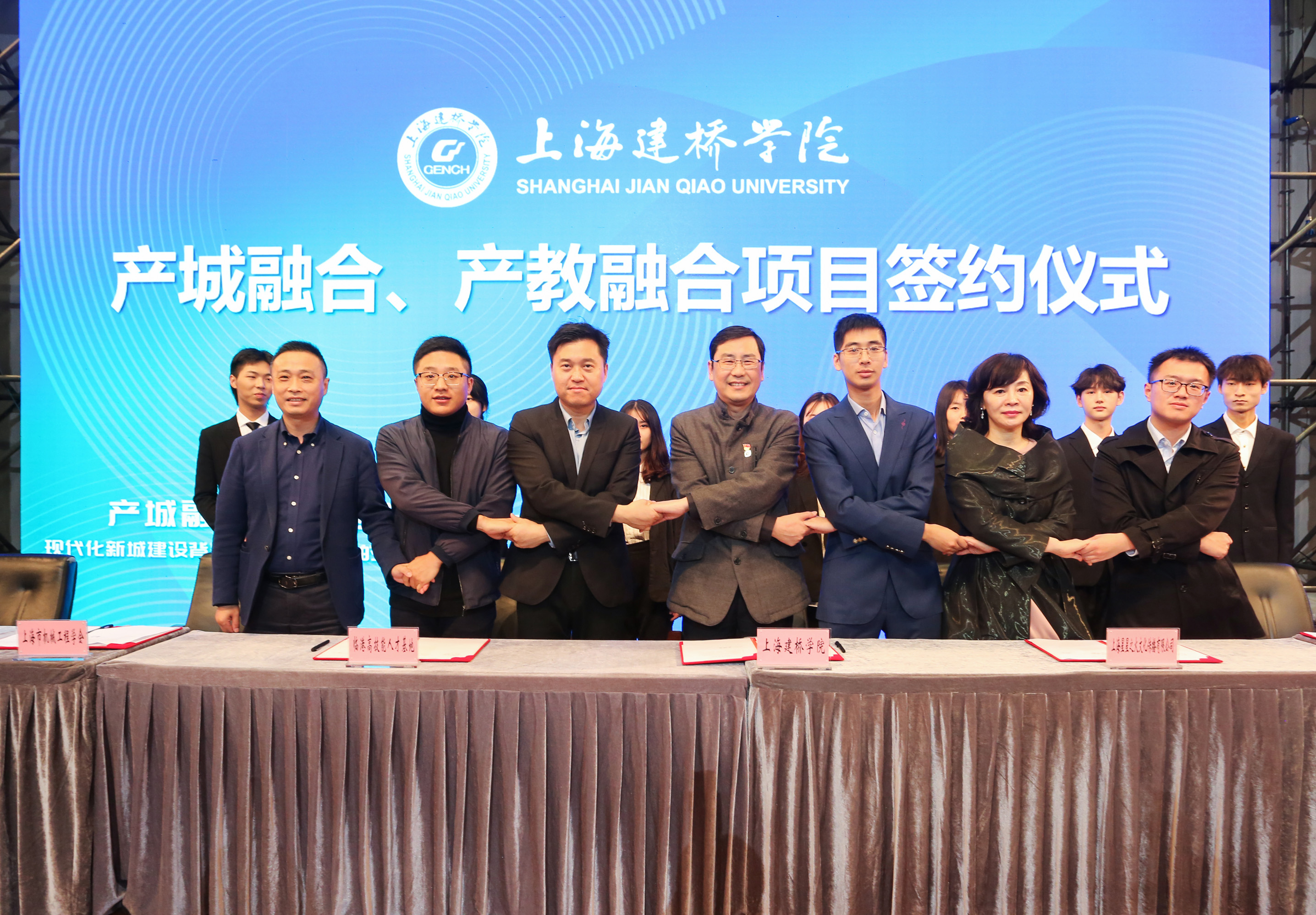 产城融合、产教融合项目签约仪式上,上海建桥学院就人力资源合作项目、无损检测实训合作项目、智能物流实训基地建设项目、文化创意合作项目、陶瓷创作基地项目、高职高技能人才基地合作项目分别与上海易盟企业(集团)有限公司、上海市机械工程学会、临港高技能人才基地、上海星星之火文化传播有限公司、上海璟通文化传播有限公司和临港高技能人才基地签署产城融合、产教融合项目合约。