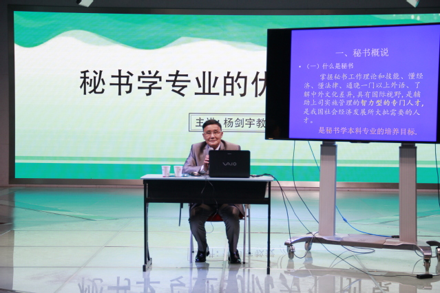 讲座上,杨剑宇教授指出当前社会对秘书人才的需求量十分巨大,秘书专业就业前景广阔,属于朝阳产业。但同时行业竞争也十分激烈,对专业秘书人才的选拔也更加严苛,因此秘书专业要多进行实景操练、多举行各类专业技能竞赛,为学生熟练掌握办文、办事、办会等各项要求提供舞台。秘书专业的学生要努力学习专业知识,练就扎实专业技能,在今后的工作中积攒经验和提升业务水平,努力成为适应社会需要的优秀的应用型秘书人才。