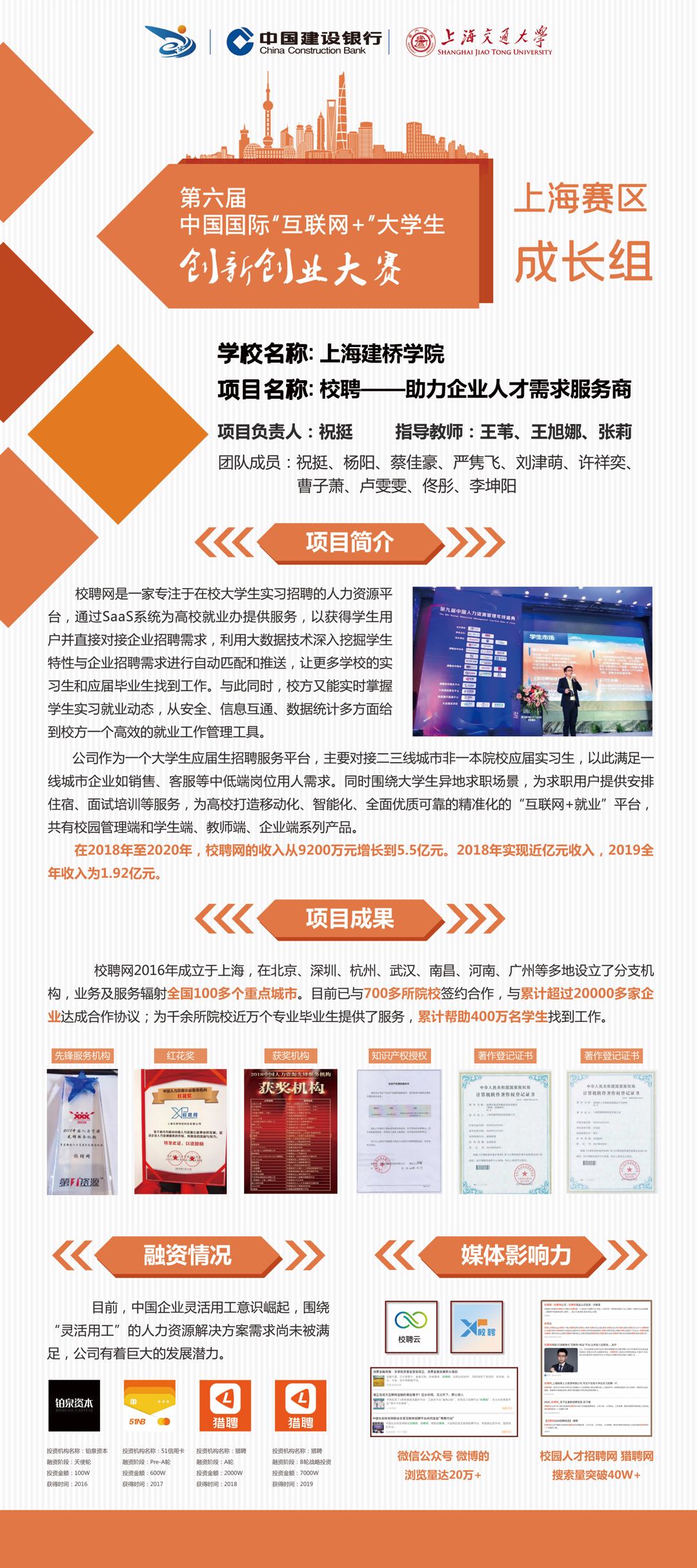 《校聘—助力企业人才需求服务商》项目由王苇、王旭娜、张莉老师指导,祝挺、杨阳、蔡佳豪等10名同学共同参与。该项目曾代表学校在大赛上海赛区首次斩获金奖,成为上海赛区高教主赛道的25个金奖项目之一。