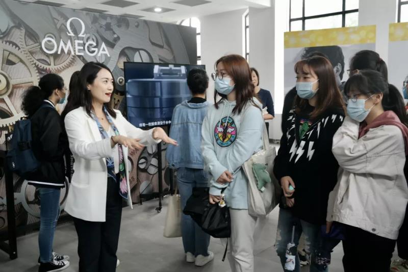 宣讲会开始之前,贲敏和王进在珠宝学院楼一层大厅带领同学们参观展厅,介绍了欧米茄在航天、奥运会上取得的成就和其内芯运用的同轴擒纵技术以及品牌的名人大使。同学们在现场认真聆听、积极互动。