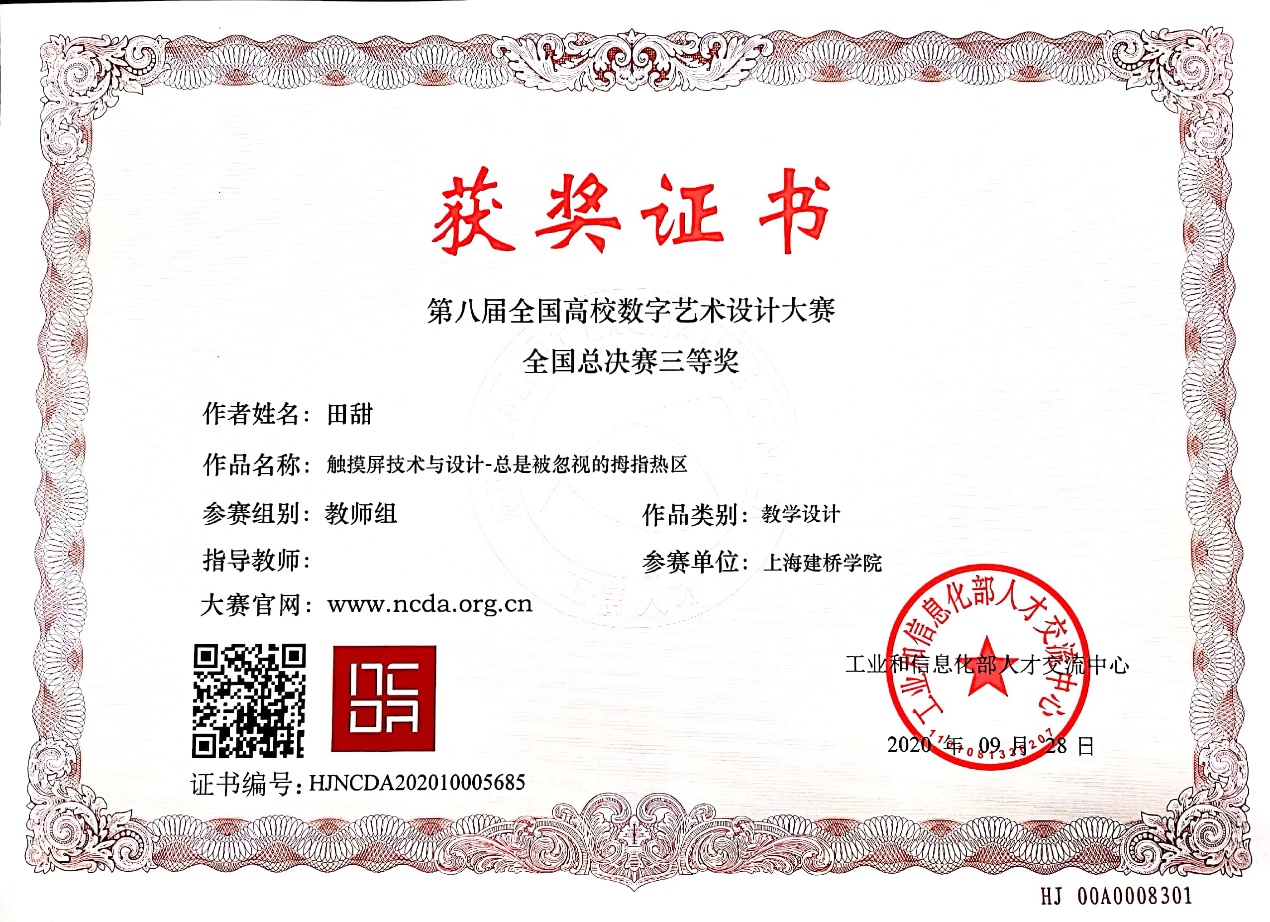 教师组中,叶明伟及田甜老师也分别以《三维设计基础》《触摸屏技术与设计——总是被忽视的拇指热区》教学设计内容参赛,并分别获三等奖。