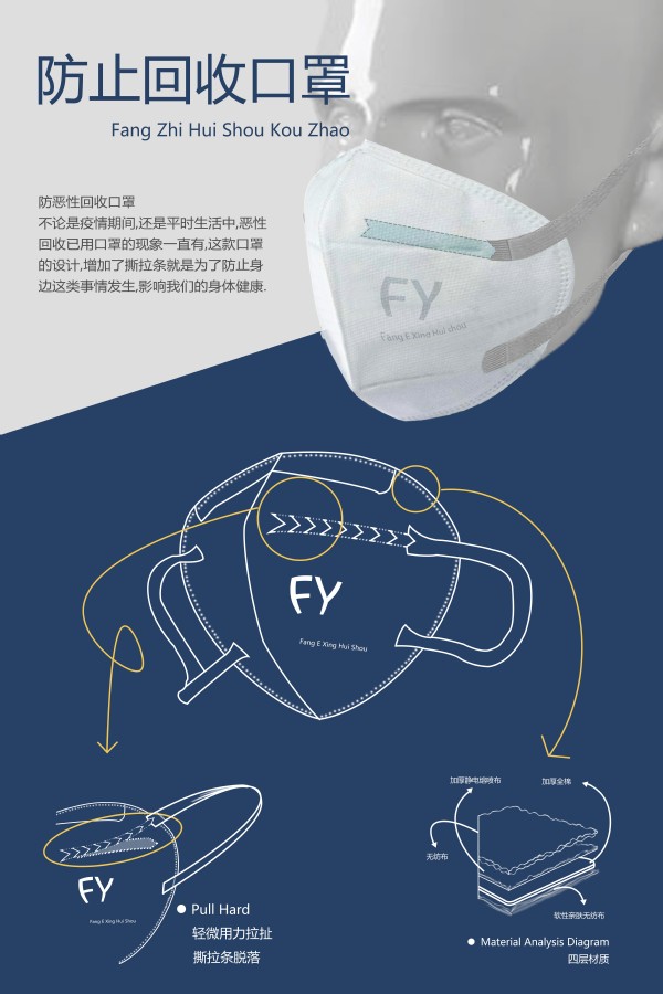 学生组中,环境空间设计类别一等奖作品《城市亲子互动空间室内设计》,施俊杰、怀忆文同学以城市化进程中家庭陪伴中亲子矛盾作为切入点,探索促进儿童适度陪伴的空间。造型设计类别一等奖作品《防止回收口罩》,蔡典汝同学考虑到疫情期间,存在的恶性回收已用口罩的现象,设计了一款有撕拉条的口罩,防止口罩恶性回收现象。