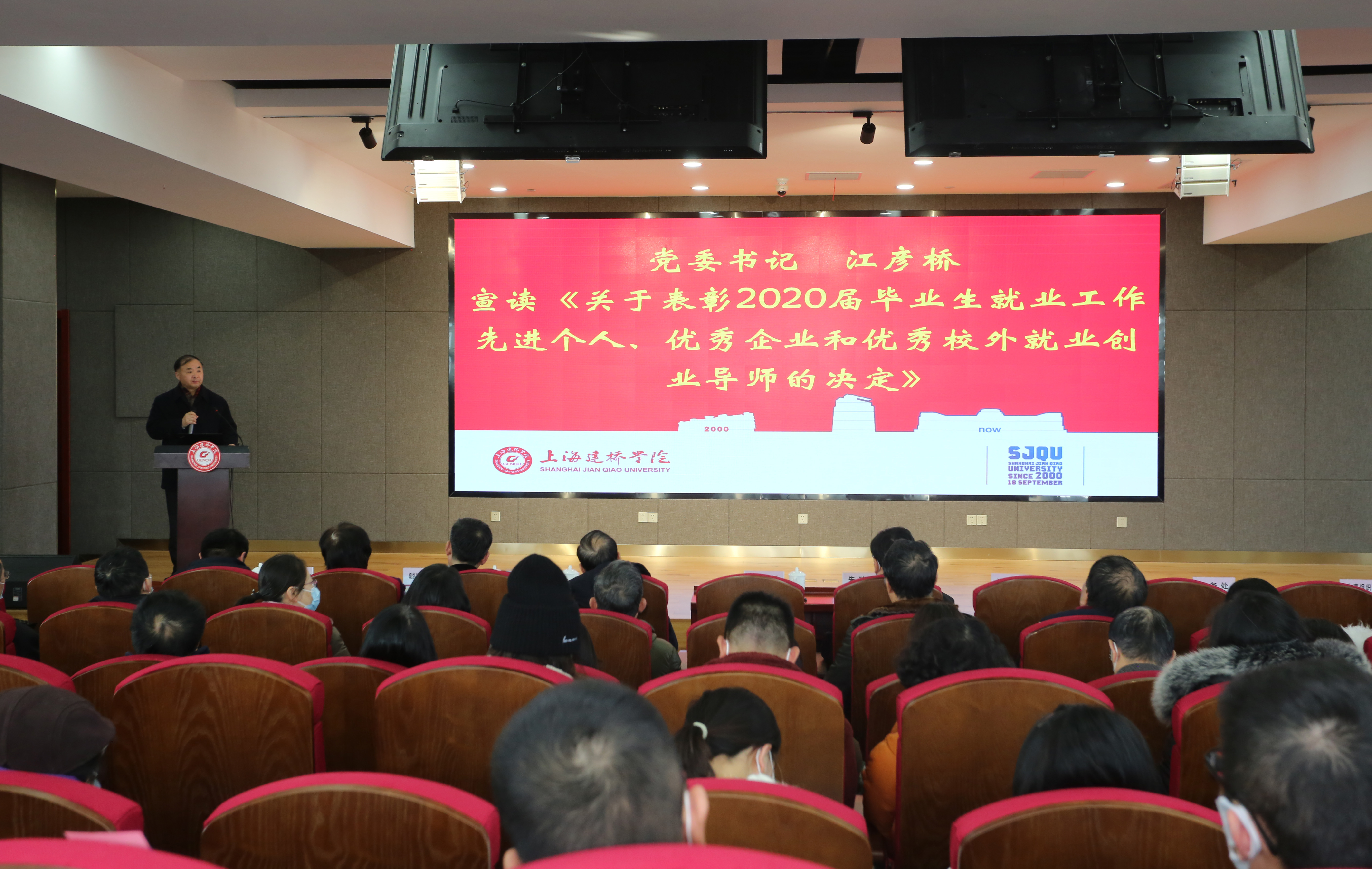 12月17日,我校2020年毕业生就业工作总结表彰会暨2021届毕业生就业工作推进会在珠宝大楼会议厅顺利举行。校长朱瑞庭,校党委书记江彦桥,副校长郑祥展、俞晓光,质量与规划办公室主任陈铮,人事处处长张宁,宣传部副部长桑正,学生处副处长王苇出席会议,各二级学院院长、教学副院长、书记、副书记、系主任,2020、2021届毕业班辅导员参加会议,学生处副处长张莉主持会议。