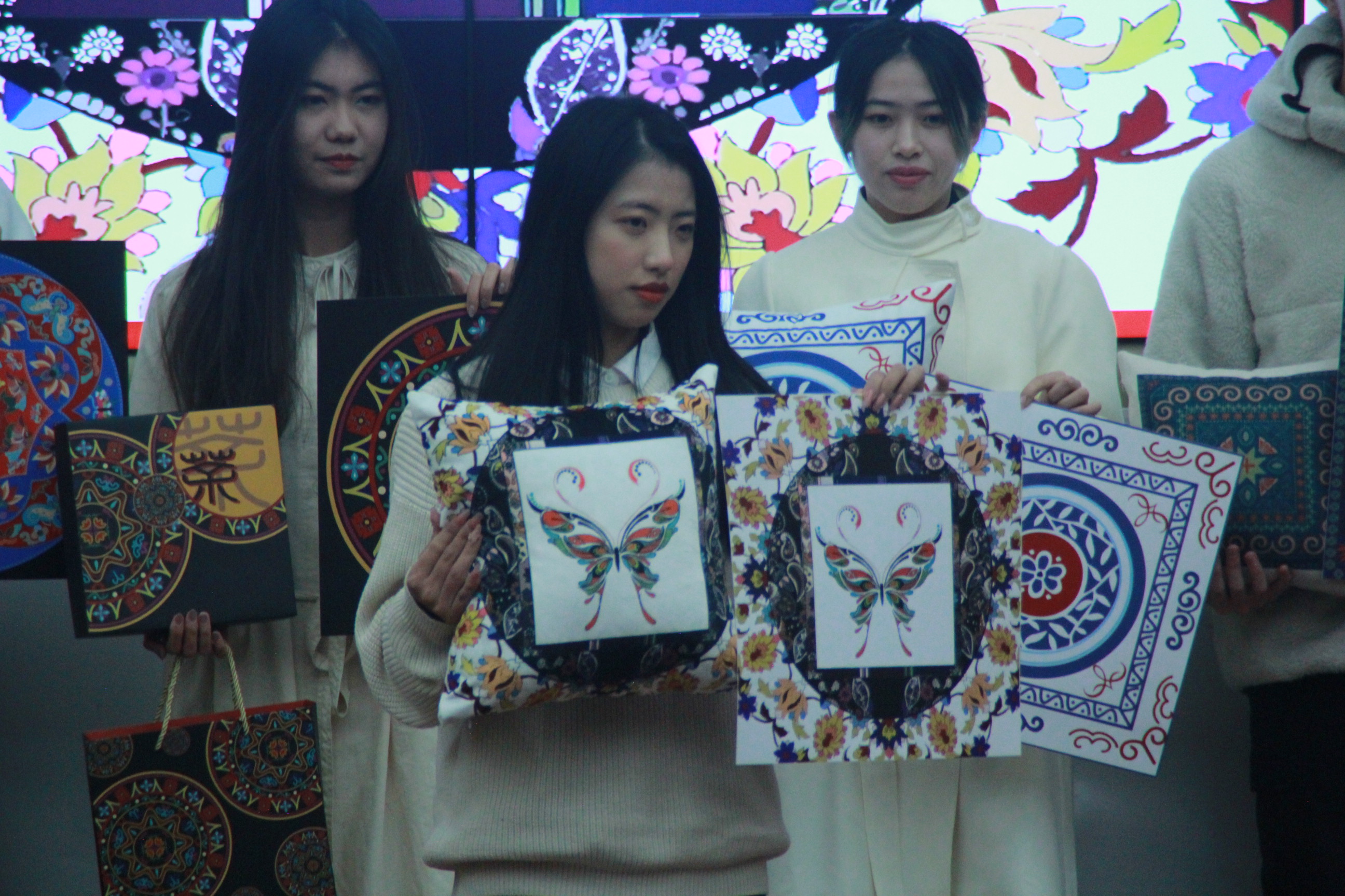 第三篇章为传承经典,文化融合。本学期的《新媒体技术与应用》弘扬优秀传统文化,展开梁祝场景的创作设计。汉服秀《明之华章》和苗绣作品设计展,进行了苗绣遇上模特秀。本学期与云南省红河州屏边县绣莉丰乡绣梦枋合作的《创意图形表现2》课程设计,创意图形表现课程所研究的形态、色彩、质感、空间、构造等内容,把屏边苗绣的美学要素融入课程教学,开拓学生的创造性思维,提高对抽象形态的审美能力,为专业设计打下形态创作基础,同时结合国家民族特色,构建更丰富的人文与精神内涵。