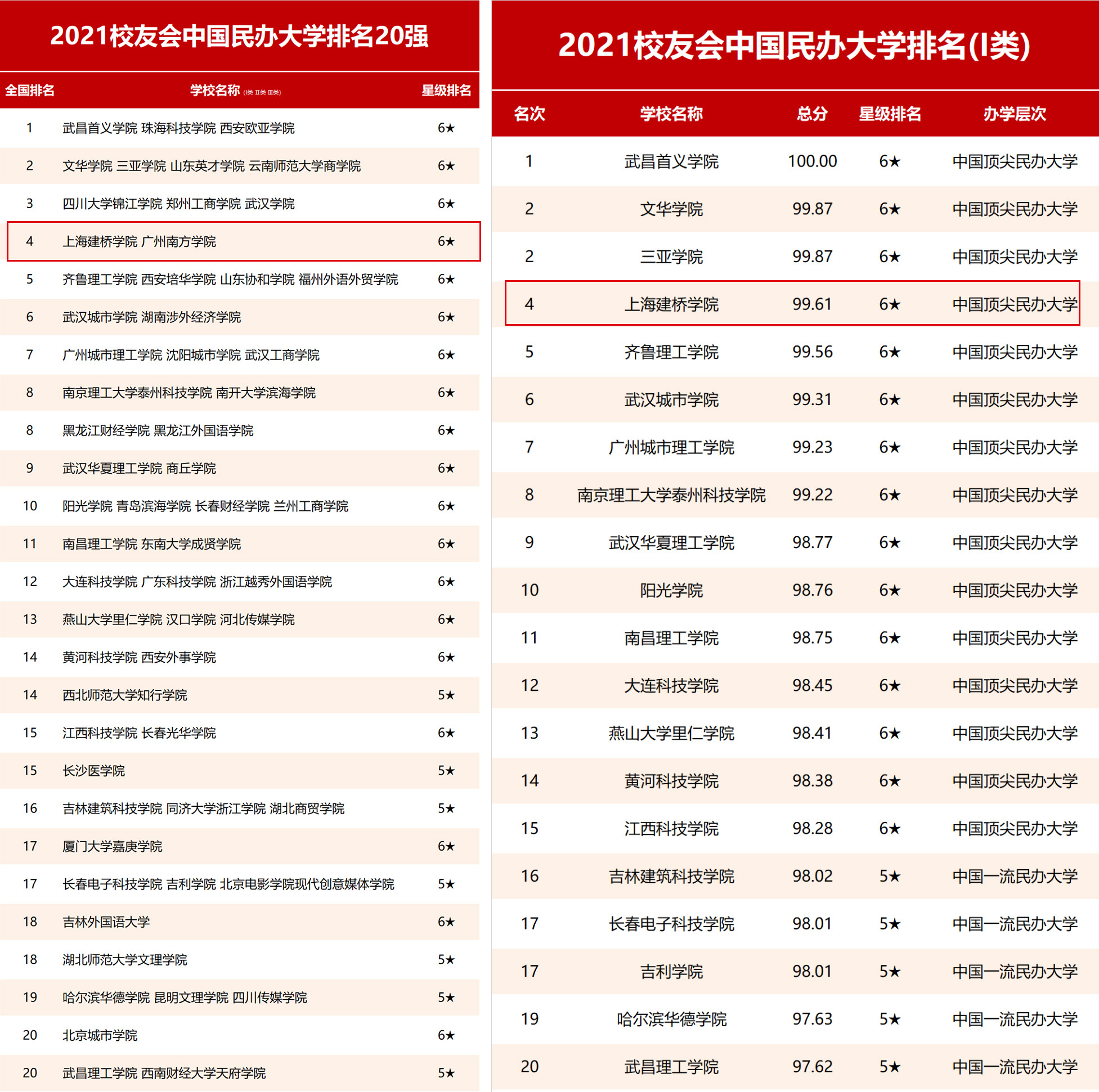2021年3月25日,全国第三方大学评价机构艾瑞深校友会网正式公布《2021校友会中国大学排名—高考志愿填报指南》,报告显示,上海建桥学院进入2021校友会中国民办大学排名前20强,位列第四,排名稳步提升。