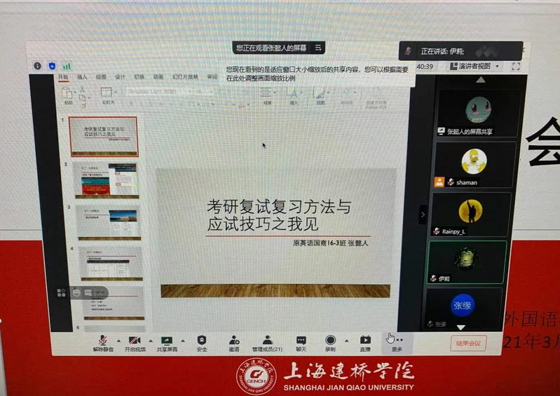 一直以来,外国语学院高度重视考研工作,大力动员和鼓励学生积极报考研究生考试,开展多种形式的动员会和交流会,为同学们搭建考研交流平台,不断推进学风建设,营造良好考研氛围。在初试结果出来后,学院领导第一时间组织线上考研复试分享会,通过学长学姐经验交流、辅导员经验分享和答疑解惑,扎实做好考研全程跟踪指导服务,帮助学生走好“最后一公里”,有力地保证了复试和调剂的成功率。