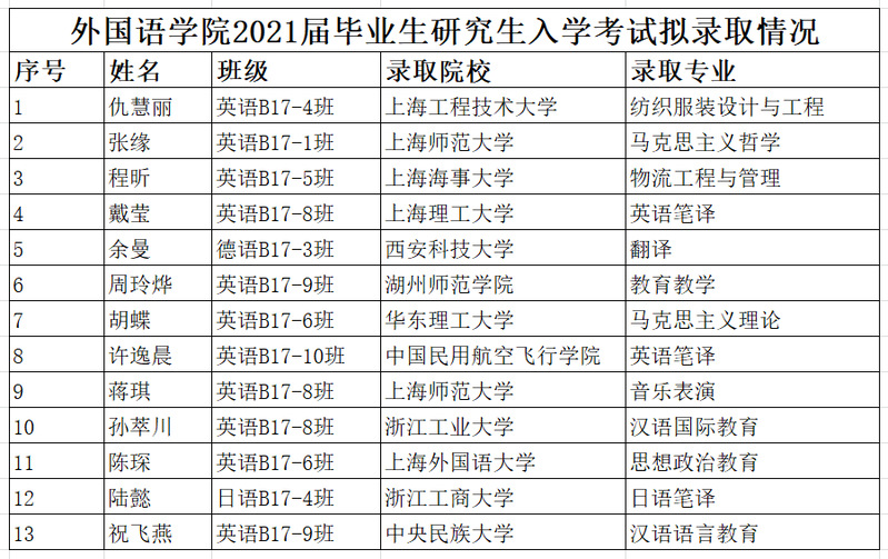 随着研究生入学考试复试结果的陆续公布,外国语学院2021届毕业生考研录取捷报频传。截止目前,外国语学院共14名毕业生分别考取了华东理工大学、上海外国语大学、上海师范大学、上海海事大学、上海理工大学、上海工程技术大学、中央民族大学、北京外国语大学等高校硕士研究生,录取人数、录取比例、录取质量均创新高。
