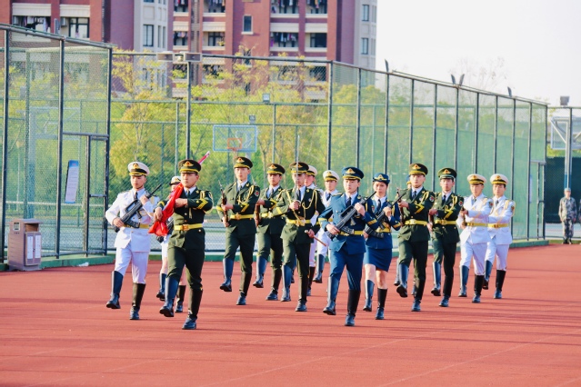 国旗护卫队迈着整齐划一、铿锵有力的步伐,护送国旗前进。八一社身穿海陆空三军军服,形成了气宇轩昂的三军仪仗队,高举着国旗,庄重而虔诚,他们迈着整齐的步伐,整齐划一,铿锵之势让众人不禁肃然起敬。