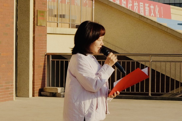 国歌声响,伴随着慷慨激昂的乐曲,鲜艳的五星红旗徐徐而升,热烈奔放的红色像是一把火炬,燃烧着爱党爱国的民族之魂。全校师生一起立正,一起敬礼,注视着鲜红的国旗。庄严雄壮的《义勇军进行曲》响起,升旗手振臂一挥,鲜艳的五星红旗迎风展开、冉冉升起,全体师生庄严肃立,向国旗行注目礼。